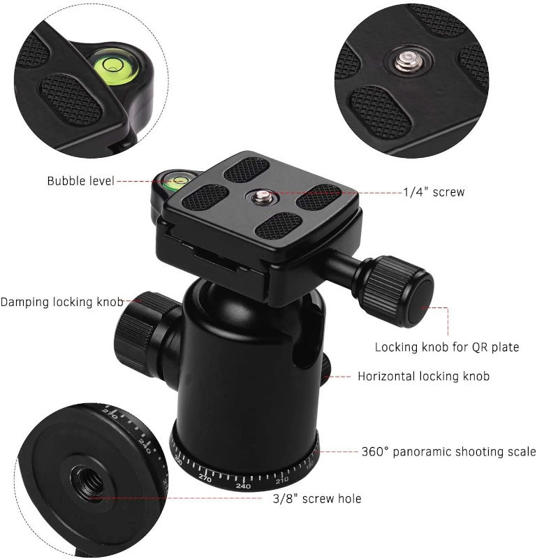 Alumíniumötvözetből készült, robosztus felépítésű gömbfej max. 10 kg-os teherbírásal. A beépített vízmérték fontos szerepet játszik a kamera pozicionálásában és a megfelelő nézet megtalálásában.Az alapon lévő szabványos 3/8-os csavarmenettel különböző professzionális állványokhoz, monopodokhoz csatlakoztatható a fej, az 1/4-es csavaros rögzítéssel pedig a legtöbb kamerával együtt használható.A precíziós kialakítású gömbfej 360°-os elforgatással alkalmas panorámaképek készításére is.